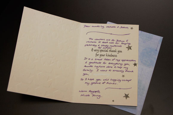 Dear Auntie Ing, Michelle & Joshua: The vouchers are for Joshua & Michelle to each use for buying stationery and study materials for school.
