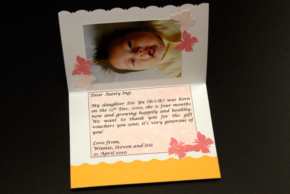 Dear Aunty Ing: My daughter Isis Yu (俞心凌) was born on the 27th Dec.2010, she is four months now and growing happily and healthy.