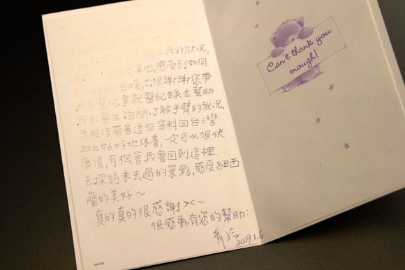 Dear馬姐姐:感謝您收到信息後來醫院探望我並幫忙我辦出院手續,聖誕節還特地來關心我的狀況,讓我即便身處異地,感受到如同家人般的溫暖,也很謝謝您帶我去醫院拿就醫記錄並幫助我和醫生詢問瞭解手臂的狀況。我相信帶著這些資料回台灣加上好好的休養,一定可以很快康復,有機會我回到這裡,去探訪未去過的景點,感受紐西蘭的美好~真的真的很感謝><~ 很感動有您的幫助!幸玲