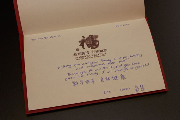 To Ma Yin Auntie: Wishing you and your family a happy, healthy and prosperous New Year. Thanks you for all the support you have given our family.