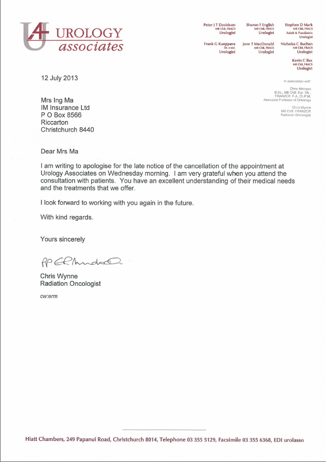Dear Mrs Ma, I am writing to apologise for the late notice of the cancellation of the appointment at Urology Associates on Wednesday morning. I am very grateful when you attend the consultation with patients. You have an excellent understanding of their medical needs and the treatments that we offer. I look forward to working with you again in the future. – From Dr Chris Wynne, Radiation Oncologist.