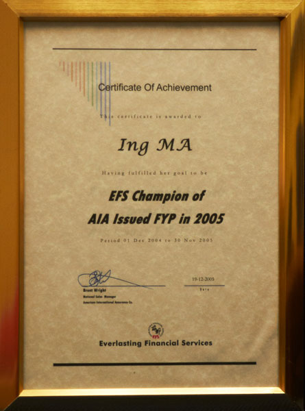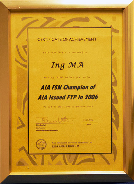 2006 全国友邦代理年度总冠军 – 马茵并应邀参加香港高峰会议颁奖