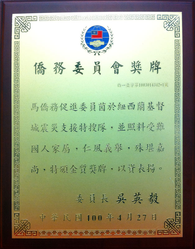 侨务委员会奖牌 – 马侨务促进委员茵于纽西兰基督城震灾支持特搜队,并照料受难国人家属,仁风义举,殊堪嘉尚,特颁金质奖牌,以资表扬。